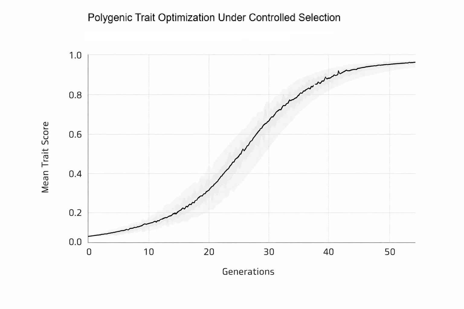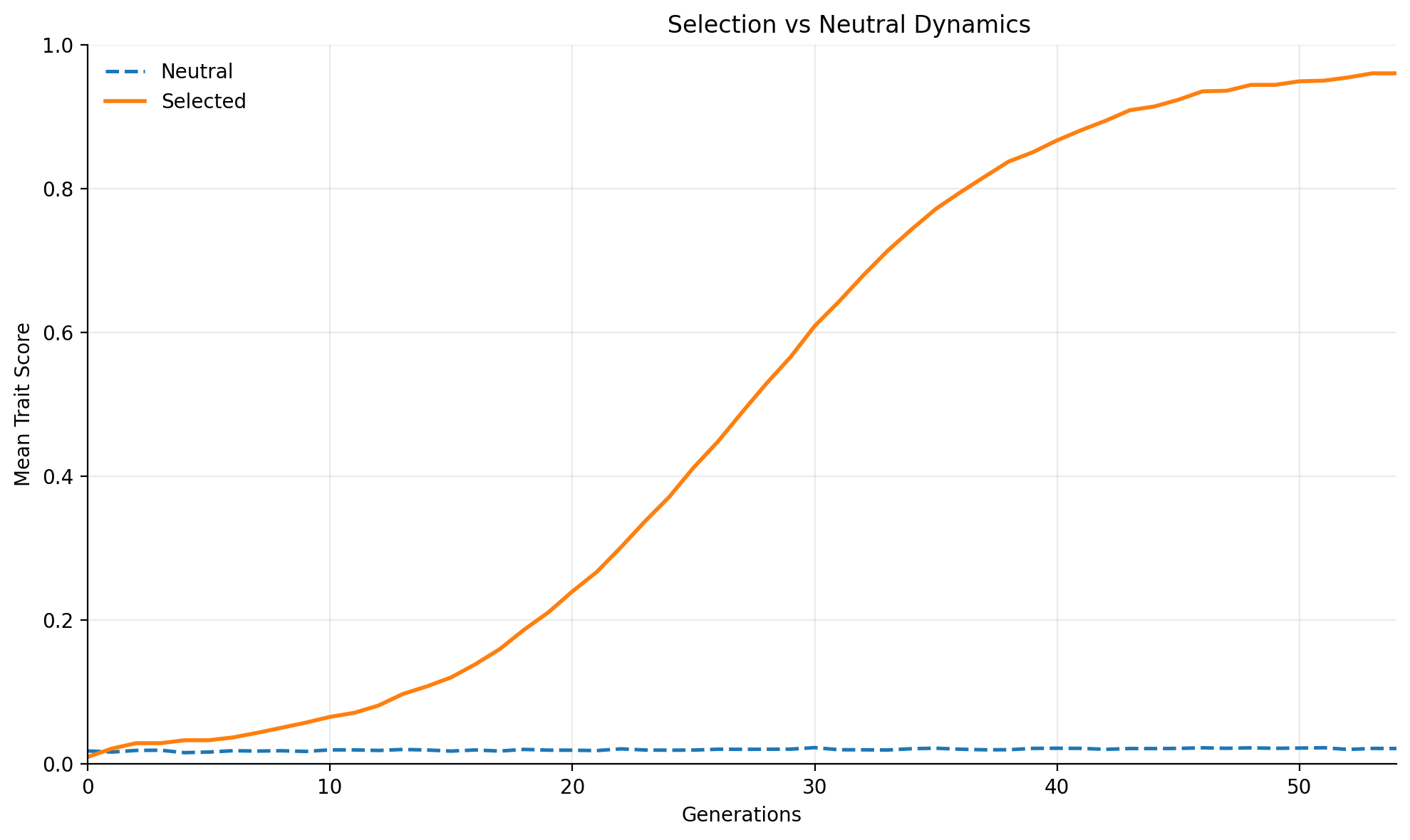 Same population and baseline parameters. Under neutral conditions, the trait remains largely stable. Under positive selection, the trait propagates rapidly and approaches saturation.